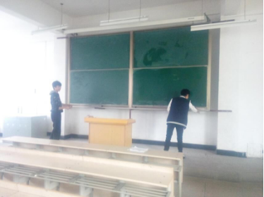 本次活动是2015-2016学年第一学期活动的延续,制定了安排详细、要求明确、分工合理的活动安排表。分派我系党员到各楼层担任负责人,带领相应的活动人员到各楼层去进行清洗黑板的活动。活动过程中,同学们每人一项工具,劲头十足的投入到分配的工作中,我们不仅仅只是清理黑板,还将老师的“三尺讲台”都一一仔细清理,将散落的粉笔一一捡入粉笔盒,并把粉笔盒摆放整齐,仔细擦拭讲台。同时我们还在黑板的旁边留下公益标语“拭去的是授业传道的痕迹,留下的是敬爱老师的关怀”以提醒同学们注意保持教学环境的整洁。