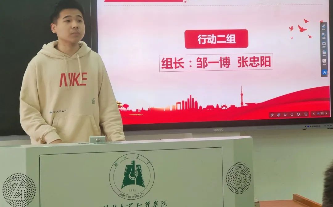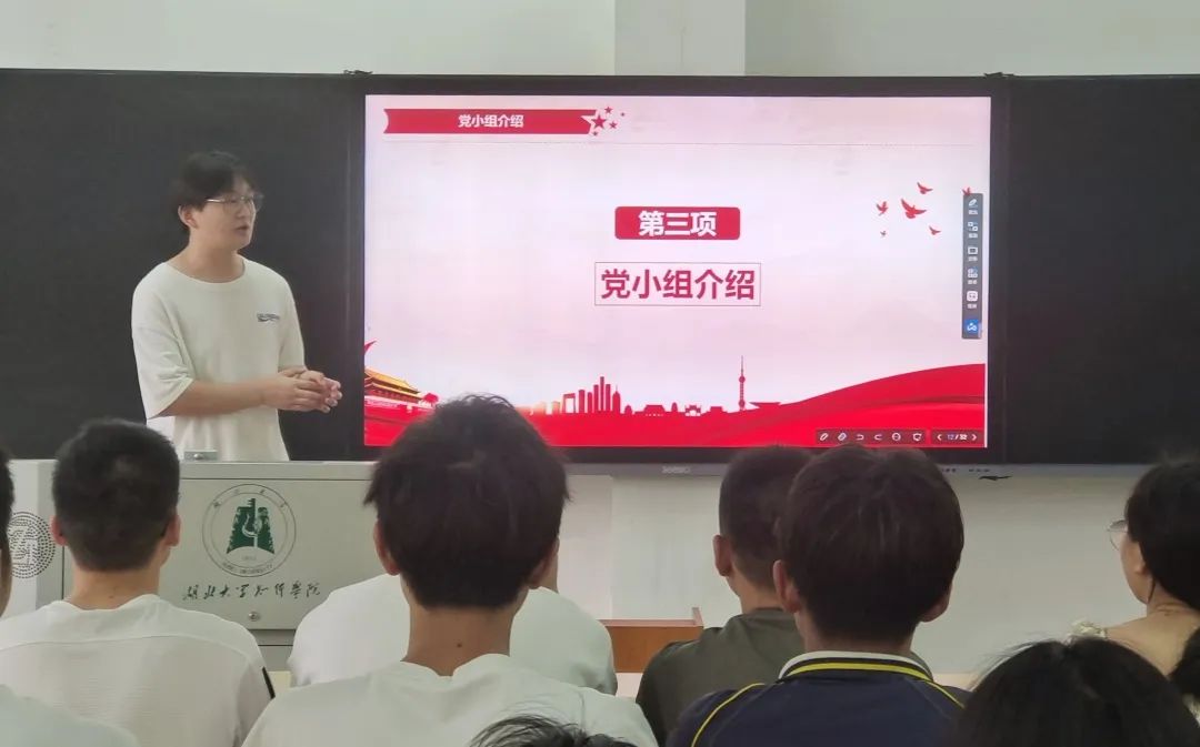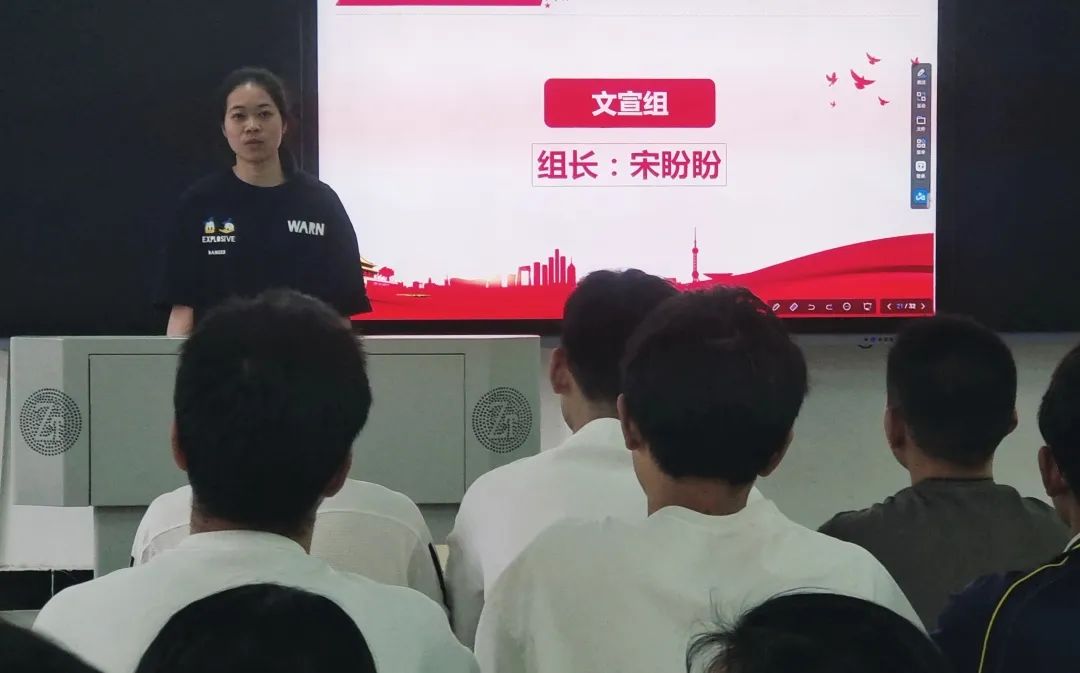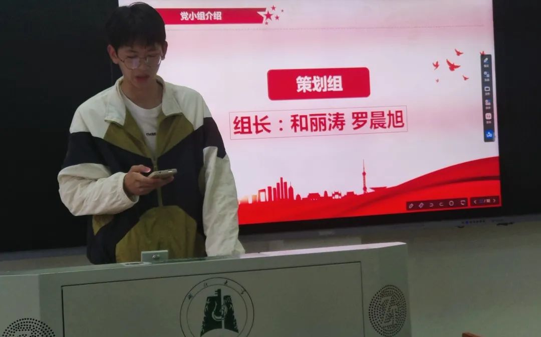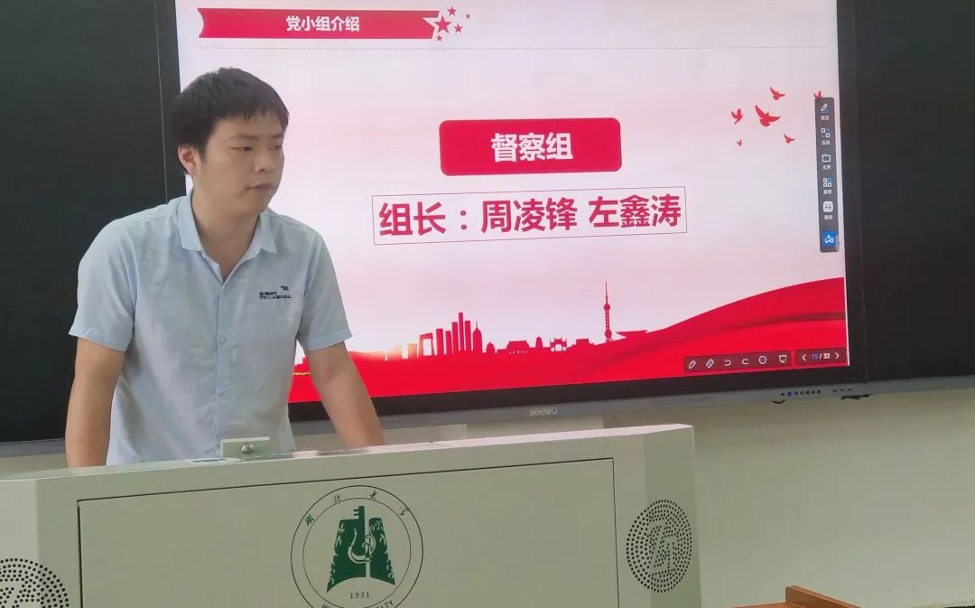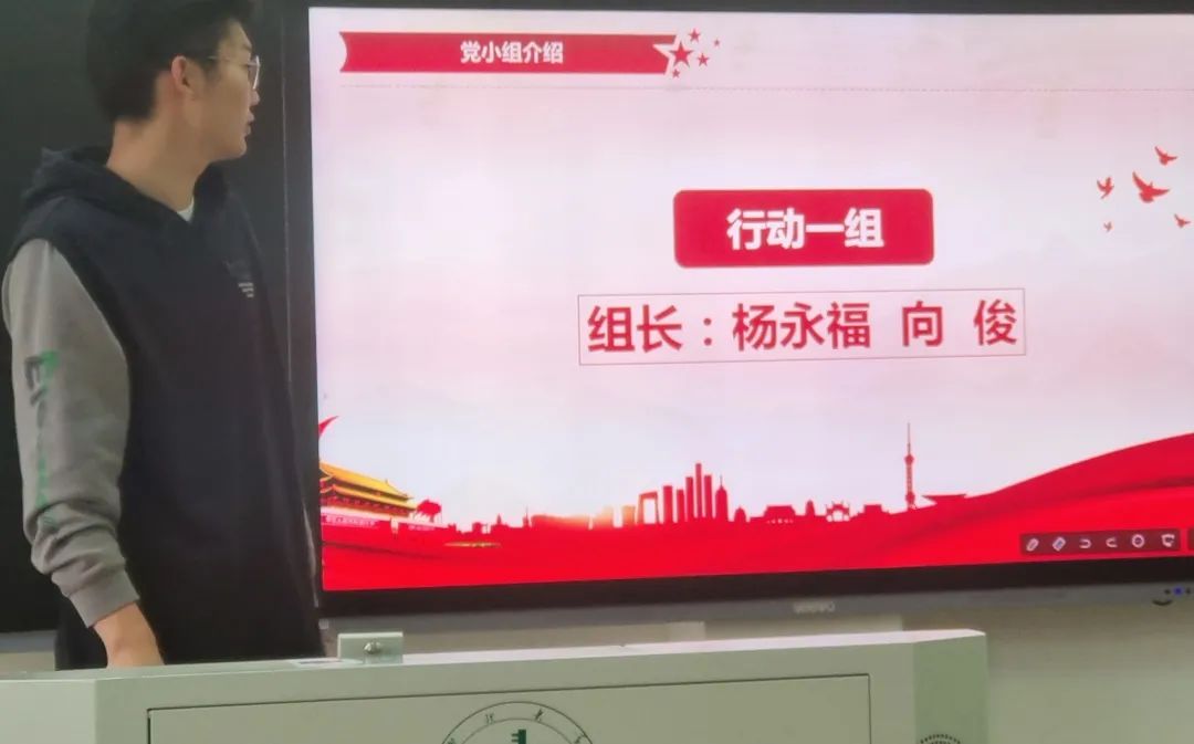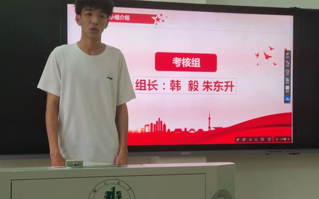分别由行动一组组长向俊同志,行动二组组长邹一博同志,督查组组长左鑫涛同志,考核组组员江嘉豪同志,文宣组组员苏春雨同志及策划组组长罗晨旭同志向学员介绍各党小组工作内容及支部评分细则。