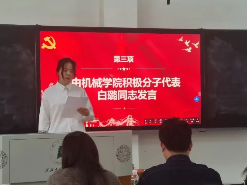 机械与自动化学院入党积极分子代表白璐上台发言,表示要进一步加强对党的理论知识的学习,端正学习态度,努力提高自身素养,工作能力,创新思维和党性修养,把政治理论知识同实际行动相结合,树立良好形象,发挥先锋模范作用,以学促进,争取早日成为一名优秀共产党员。