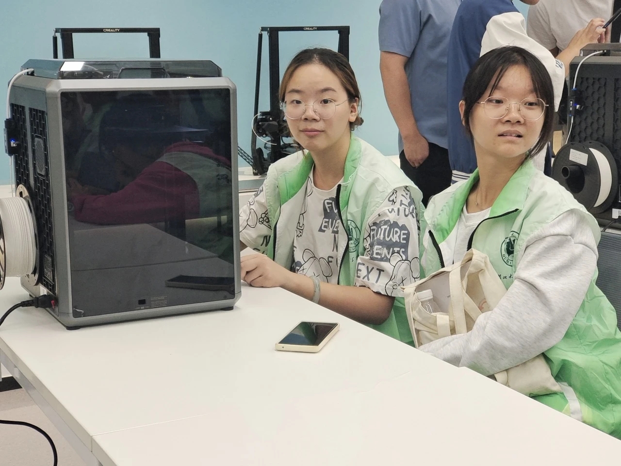 接下来,志愿团队跟随讲解员的脚步,来到公司的车间。在进入车间前,应工作人员的要求,志愿者们都换上了无菌鞋套,这一小小细节体现了创想三维公司生产过程的严谨细致。在这里,志愿者们见证了一个产品从原材料到零部件再到整产品的全过程,人工与高自动化机器巧妙配合,生产过程精密有序,让志愿者们深刻感受到3D打印的无限未来。
