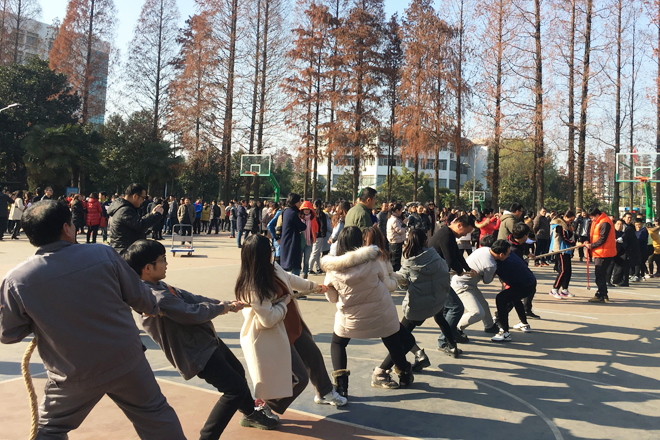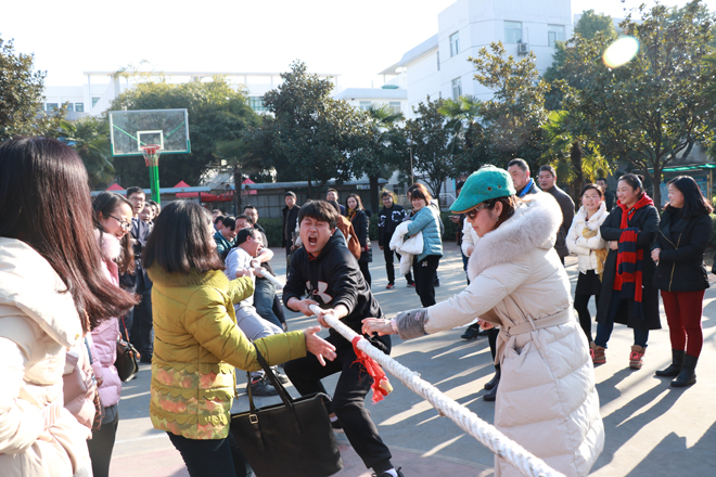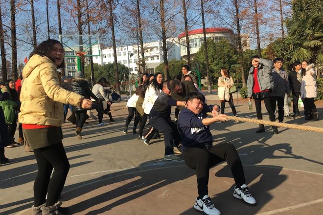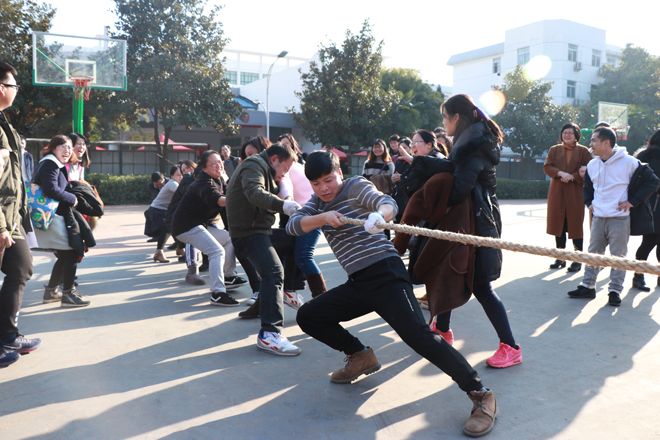 为丰富教职工校园文化生活,增强团队凝聚力,激发教职工参与体育健身的积极性,12月20日下午,学校在篮球运动场举行教职工拔河比赛。全校17个工会小组参加比赛。