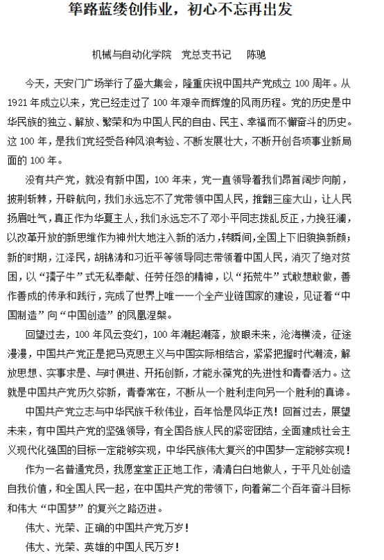 2021年7月1日上午八时,庆祝中国共产党成立100周年大会在北京天安门广场隆重举行。机械与自动化学院党总支于7时40分许组织全体教职工党员、学生党员共53人在机械学院党员活动室集中观看了庆祝此次盛典。