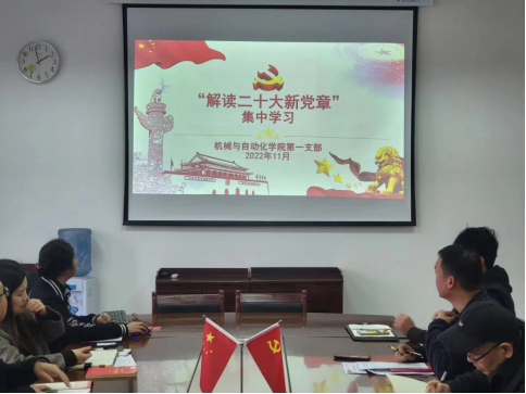 机械与自动化学院教工党支部2022年11月23日在知真楼311举行“解读二十大新党章”集中学习。机械学院全体教工党员出席会议,会议由吴茜同志主持。