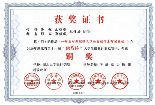 按照疫情防控常态化要求,本届竞赛采用线上评比方式,经过激烈的角逐,开云官网学子付钰,龚林,乐欣荣,郭旺,张磊,郭继成,孔维安以参赛作品《一种应对新冠肺炎下的自动消毒智能拐杖》在湖北省第十二届“挑战杯”大学生创业作品竞赛荣获铜奖!