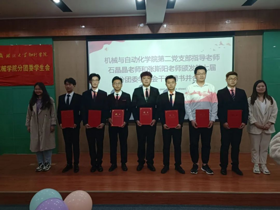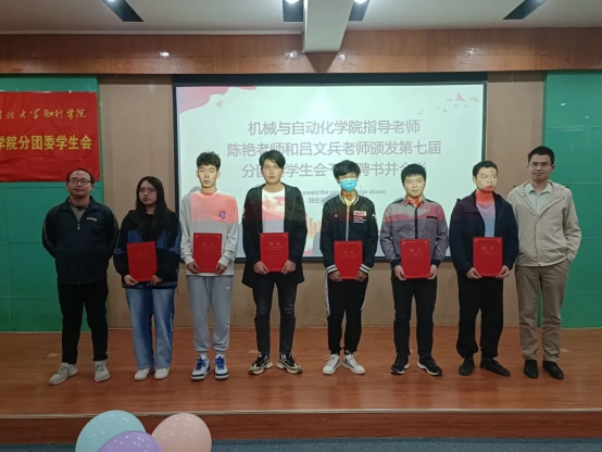 机械与自动化学院第二党支部王松书记为第七届分团委学生会主席团颁发聘书并合影。